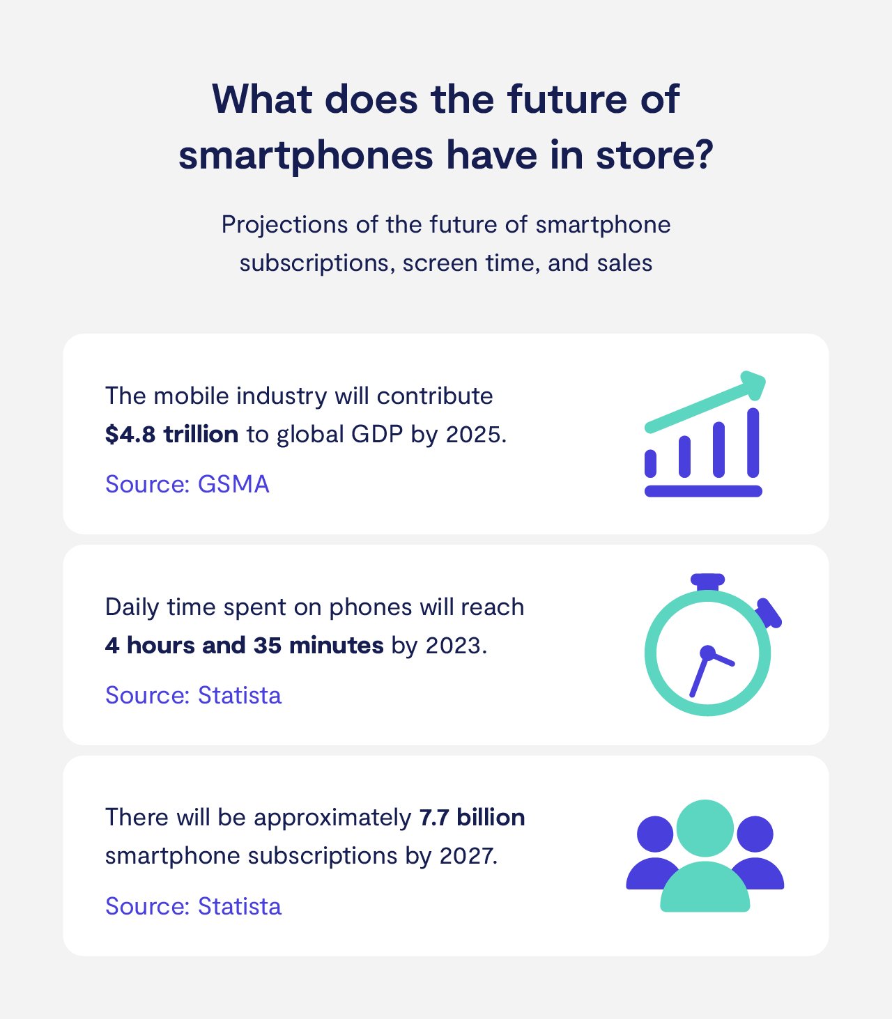 According to a 2022 study, there are projected to be 7.7 billion smartphone subscriptions in 2027 (Statista). That marks an increase of about 18% in subscriptions from 2021 to 2027.