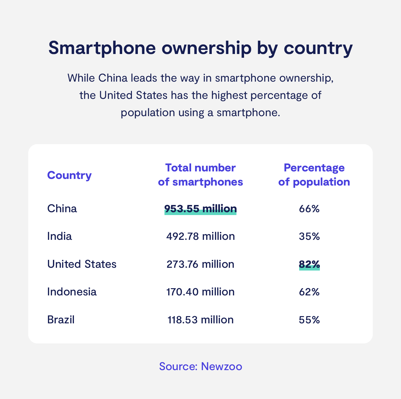 Approximately 273.76 million Americans own smartphones (Newzoo Global Market Report 2020). That accounts for 82.2% of America’s population and makes it the country with the highest percentage of smartphone users.